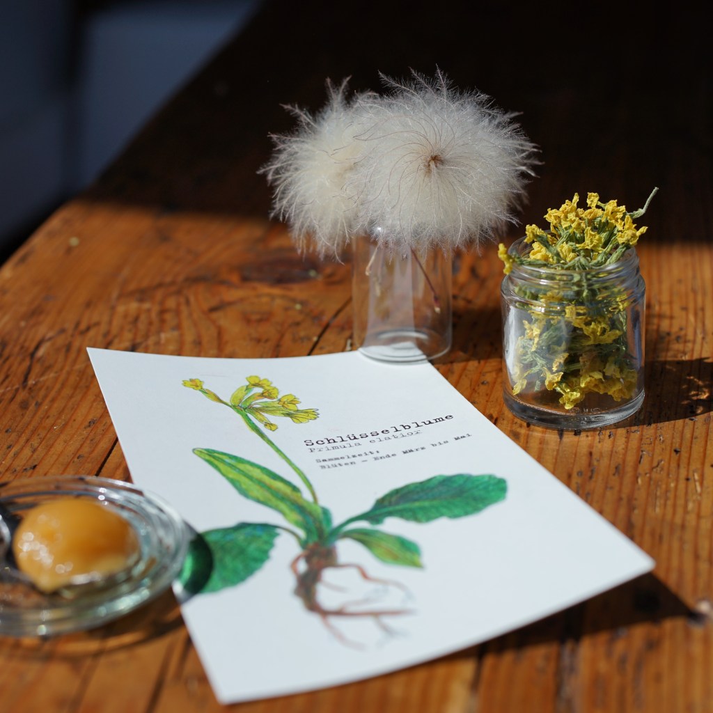 Zutaten: Schlüsselblumen-Auszug (Basis BIO-Olivenöl), BIO-Shea-Butter, BIO-Bienenwachs, BIO-Blütenhonig, ätherisches Lavendelöl BIO, ätherisches Rosengeranienöl BIO, ätherisches Orangenöl BIO